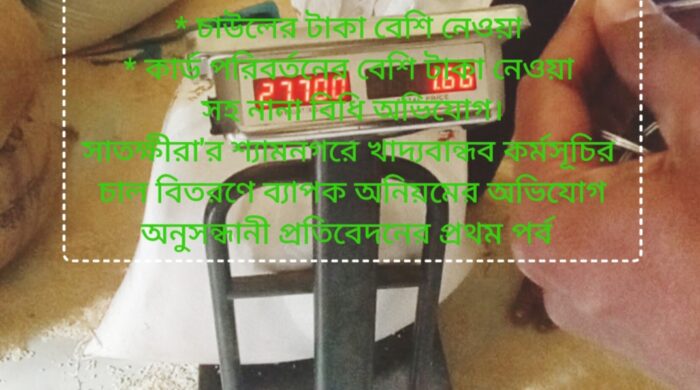 * চাউল কমদেওয়া * চাউলের টাকা বেশি নেওয়া * কার্ড পরিবর্তনের বেশি টাকা নেওয়া সহ নানা বিধি অভিযোগ। অনুসন্ধানী প্রতিবেদনের প্রথম পর্ব…… সাতক্ষীরা’র শ্যামনগর উপজেলায় হতদরিদ্রদের জন্য বরাদ্দকৃত খাদ্যবান্ধব কর্মসূচির বিস্তারিত...